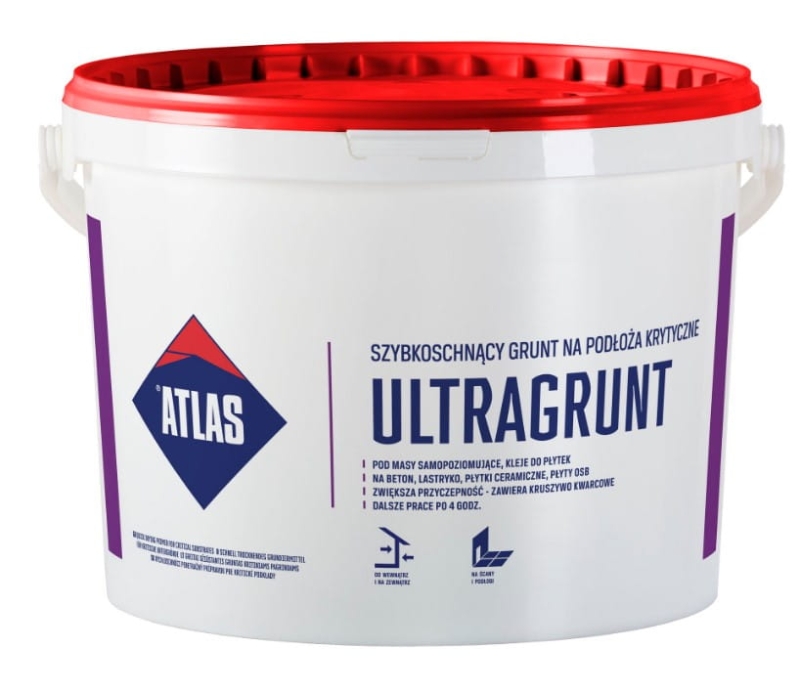 Grunt szybkoschnący na podłoże krytyczne Atlas Ultragrunt 5 kgT jest gotową do użycia masą, produkowaną na bazie żywic polimerowych z dodatkiem selekcjonowanego kruszywa kwarcowego. Charakteryzuje się doskonałą przyczepnością do podłoży niechłonnych i do podłoży o bardzo gładkiej powierzchni – dla podłoża betonowego przyczepność wynosi minimum 1,0 MPa.