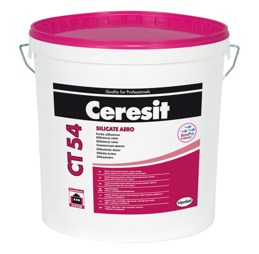Farba silikatowa CERESIT CT 54 produkowana jest w ponad 200 kolorach. Wykonana nią powłoka jest matowa i odporna na niekorzystne warunki atmosferyczne. Posiada zabezpieczenie przed porażeniami biologicznymi, np. grzybami, pleśniami czy algami. Po dodaniu wody może służyć jako farba egalizacyjna.
