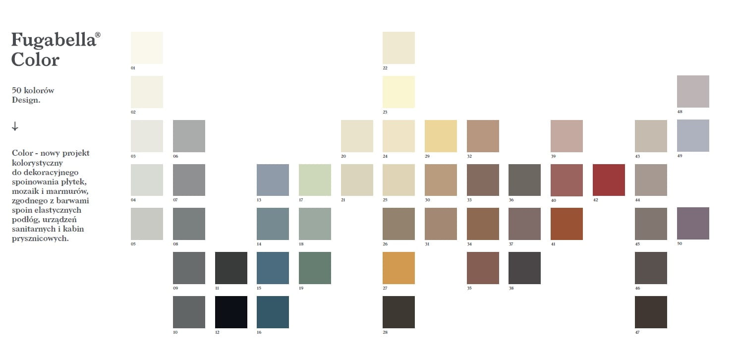 Fugabella Color jest rewolucyjną, hybrydową spoiną dekoracyjną do wszelkich powierzchni z gresu, mozaik i kamieni naturalnych. Fugabella® Color charakteryzuje się hydrofobowością, niezwykle niską chłonnością wody, wysoką twardością powierzchni, podwyższoną odpornością na najczęście spotykane substancje kwasowe i całkowitą jednorodnością koloru.