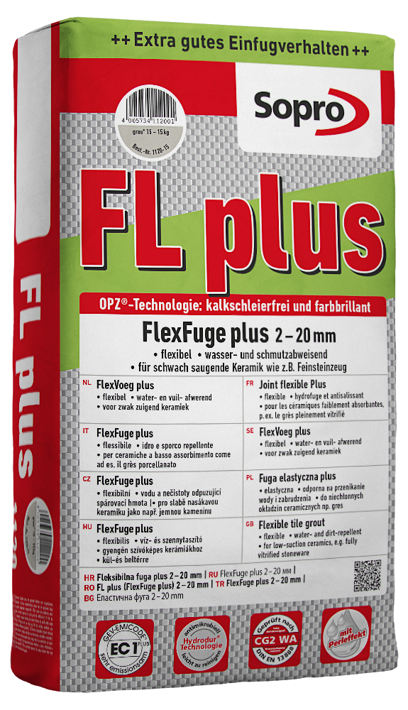 Sopro FL PLUS jest elastyczną, mrozoodporną, szybkowiążącą, cementową zaprawą fugową, nadającą się do szybkiego obciążania. Przeznaczona jest do spoinowania okładzin wykonanych z: płyt kamiennych, betonowych, gresowych, kamionkowych, klinkierowych, ceramicznych płyt łupanych oraz pustaków szklanych.