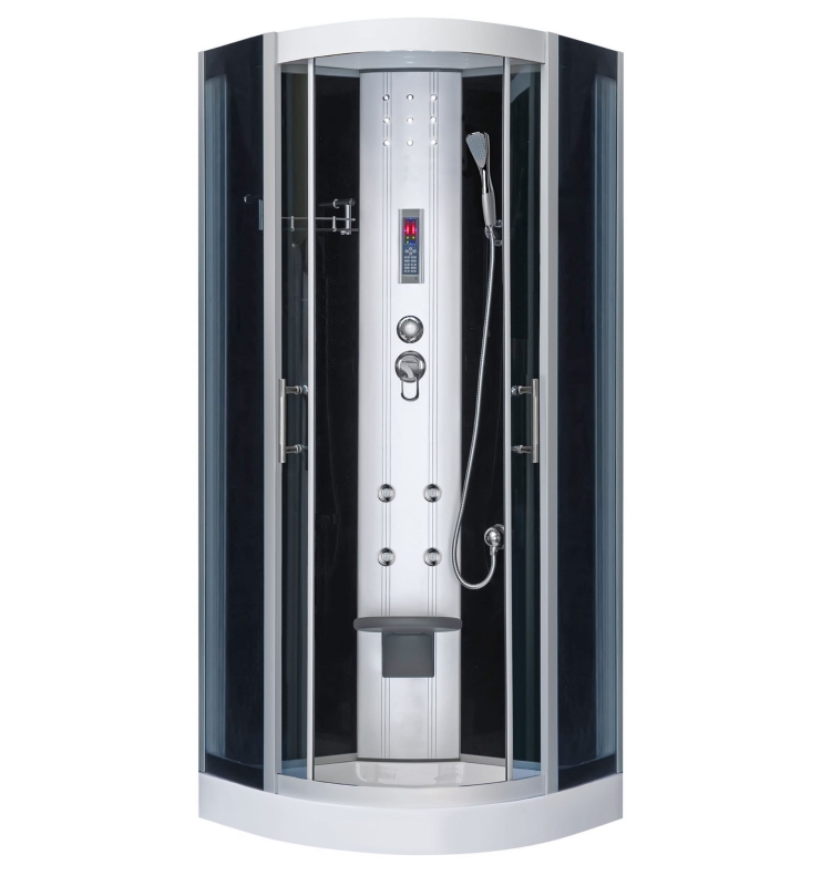 Kabina wyposażona jest w panel sterujący, wentylator, radio, oświetlenie LED, półkę szklaną z relingiem