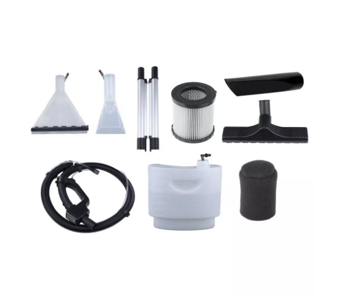 W zestawie wraz z odkurzaczem znajdują się liczne akcesoria m.in. szczotkę do prania dywanów, szczotkę do prania tapicerki czy zbiornik na wodę z detergentem