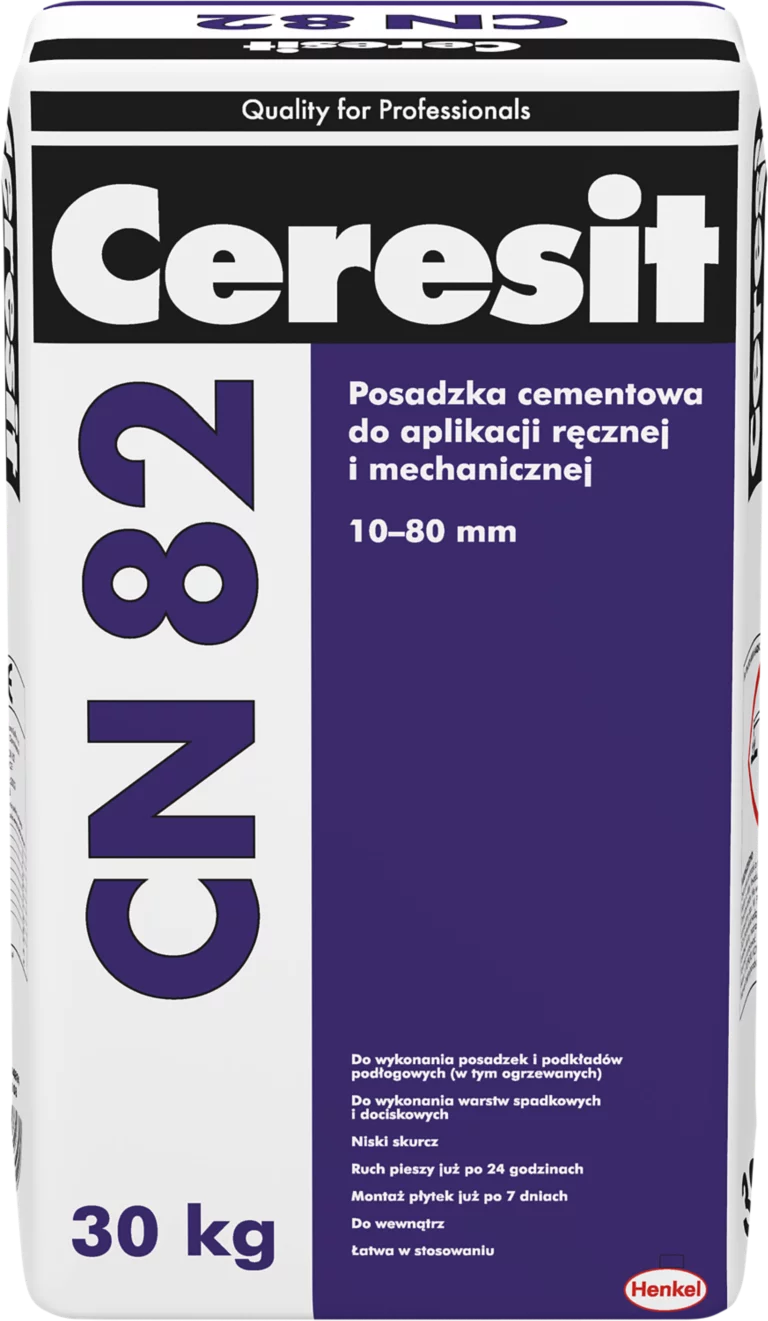 Ceresit CN 82 – profesjonalna posadzka cementowa do wykonywania podkładów podłogowych o grubości od 10 do 80 mm. Zaprawa nadaje się do napraw posadzek i elementów betonowych oraz jako podkład pod płytki, panele i deski podłogowe.