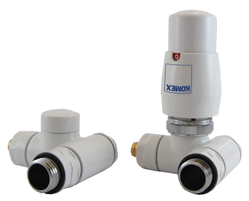 Zawór termostatyczny INTEGRA lewy pod grzałkę biały z głowicą KOMEX - zestaw