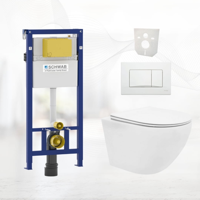 Zestaw SCHWAB: stelaz Duplo 189 + przycisk biały DOTS DUO + podkladka WC + miska WC Rea Carlo mini Reimless z deską REA wolnoopadajacą