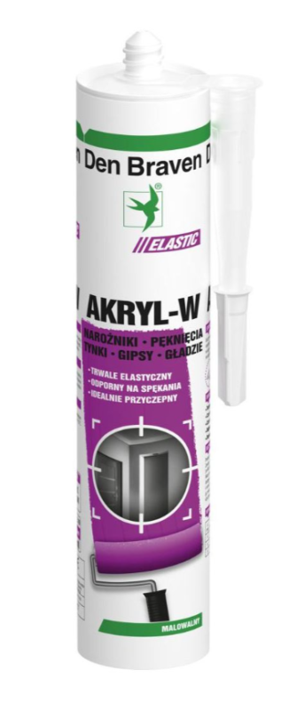 Den Braven Akryl-W to wysoce plastyczno-elastyczny kit uszczelniający na bazie wodnej dyspersji akrylowej, do wypełniania rys, spoin i pęknięć w ścianach i sufitach.