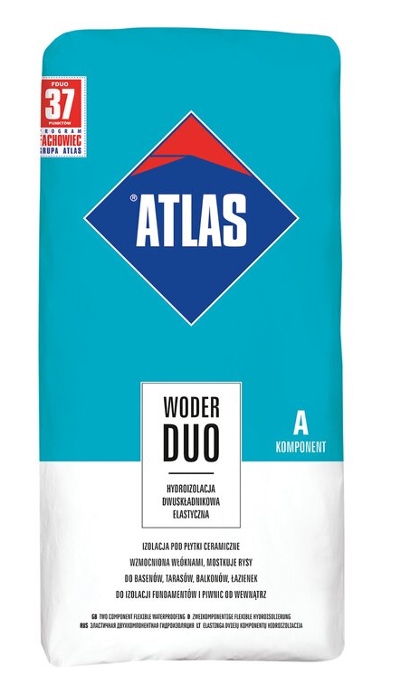 - ATLAS WODER DUO jest dwuskładnikową kompozycją, uzyskiwaną przez wymieszanie w proporcji wagowej 3 : 1 składnika A (sucha mieszanka barwy szarej, zawierająca cement, wypełniacze i dodatki modyfikujące) i składnika B (biała emulsja, zawierająca żywice syntetyczne i dodatki modyfikujące)