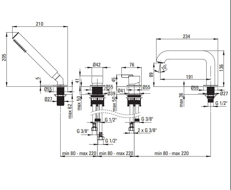 Bateria wannowa 4-otworowa z zestawem prysznicowym Deante Silia titanium