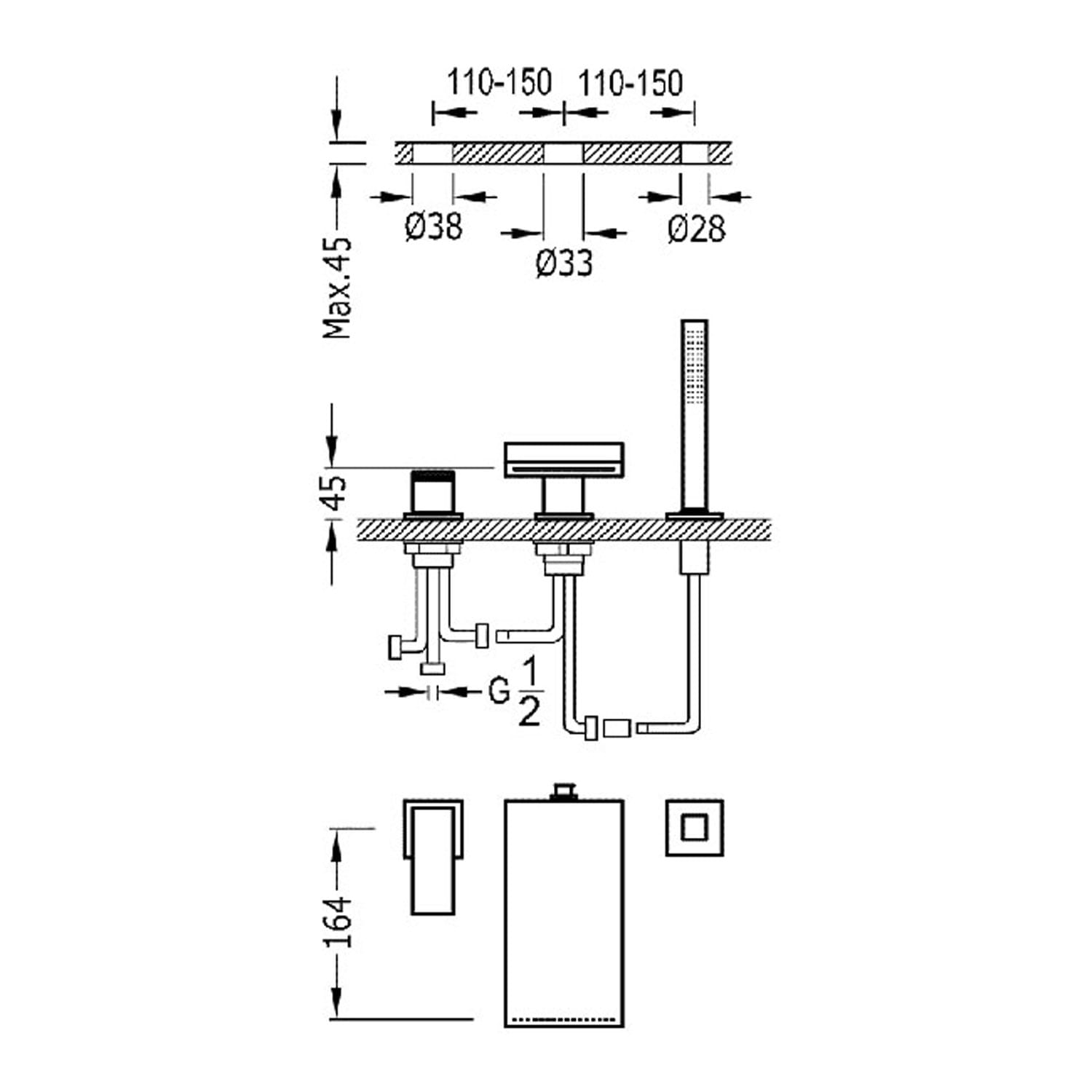 - Wylewka wannowa z wyjściem wody w formie kaskady: 164 mm