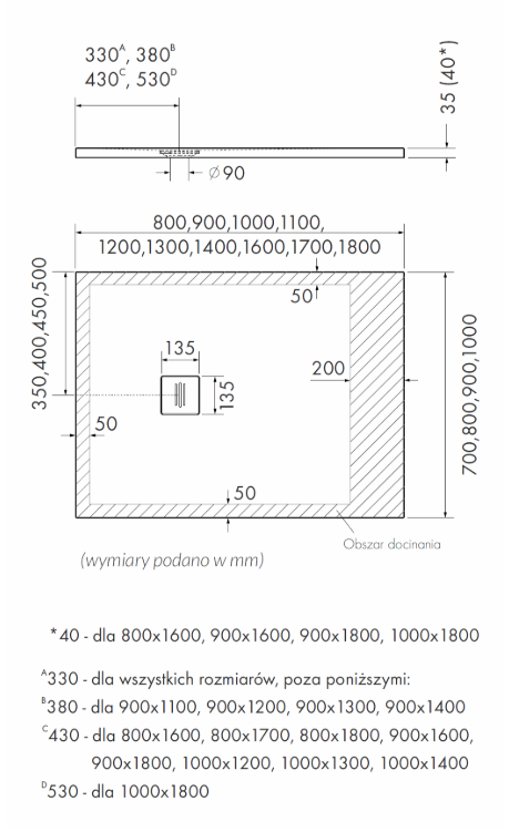 Prostokątny brodzik prysznicowy z powierzchnią o strukturze kamienia.