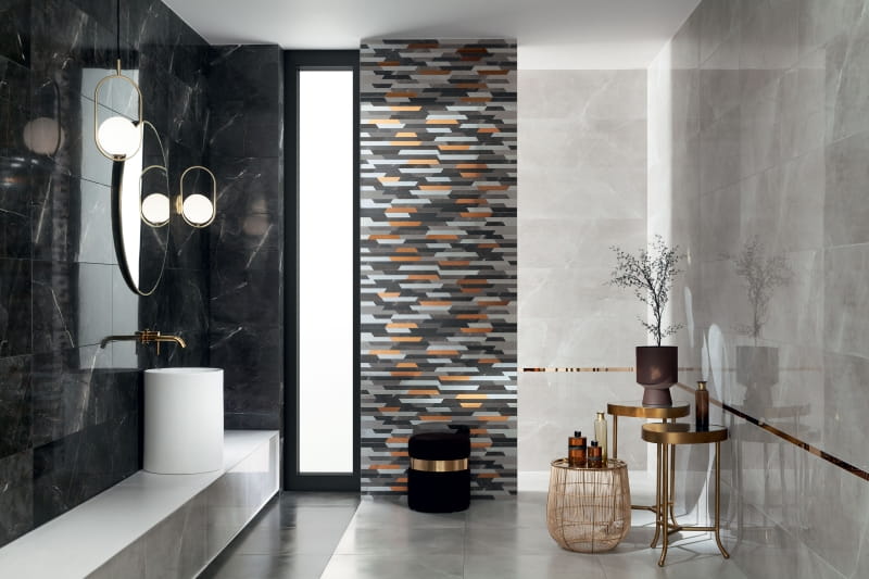 Brainstorm ukazuje fascynację intensywnością burzy. Odkryj niesamowitą grę światła i cienia na tle ciemnego marmuru o wyrazistym rysunku, w połączeniu z metalicznymi, elektryzującymi dekoracjami.