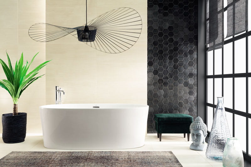 Inspiracją przy tworzeniu kolekcji Horizon był naturalny trawertyn. Stąd płytki ścienne w subtelnym, beżowym odcieniu. Horizon to także dekory oraz mozaiki ścienne w dwóch kolorach – beżowym i czarnym. Heksagonalne kształty i proste przecięcia to prawdziwa nowoczesność. Takie właśnie pomieszczenia powstają z użyciem tej kolekcji.