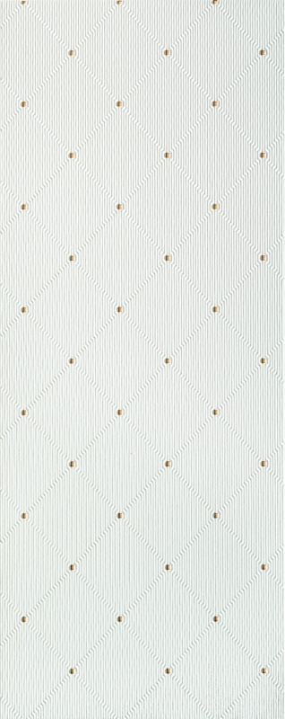 W świetlistej kolekcji Lumiere utrzymane w tonacji bieli wnętrze łagodnie koi zmysły. Delikatny, geometryczny wzór, zbudowany z reliefowych linii, przyciąga uwagę złotymi, matowymi punktami. Zestawiony z marmurem śmiało zagości w eleganckich, klasycznych łazienkach, dodając im subtelności i elegancji.