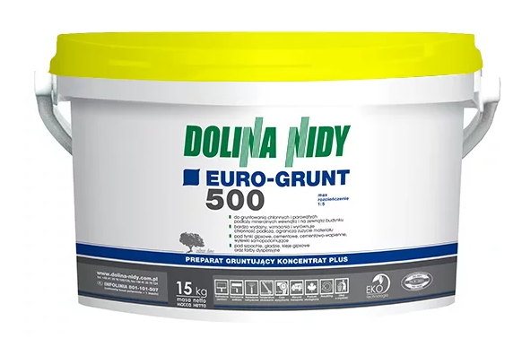 Euro-Grunt 500 to uniwerslany, głęboko penetrujący preparat gruntujący w postaci żółtego koncentratu, wyprodukowany na bazie żywic akrylowych.