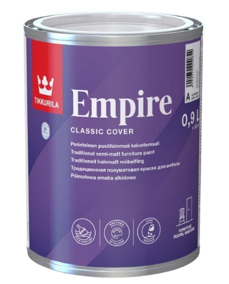 Przeznaczona do malowania drewnianych i metalowych powierzchni wewnątrz oraz na zewnątrz pomieszczeń według instrukcji. Elementy użytkowe takie jak meble, ogrodzenia, drabiny, balustrady, maszty, stelaże itp. Tikkurila Empire wyrównuje powierzchnię i jest idealna do aplikacji pędzlem.