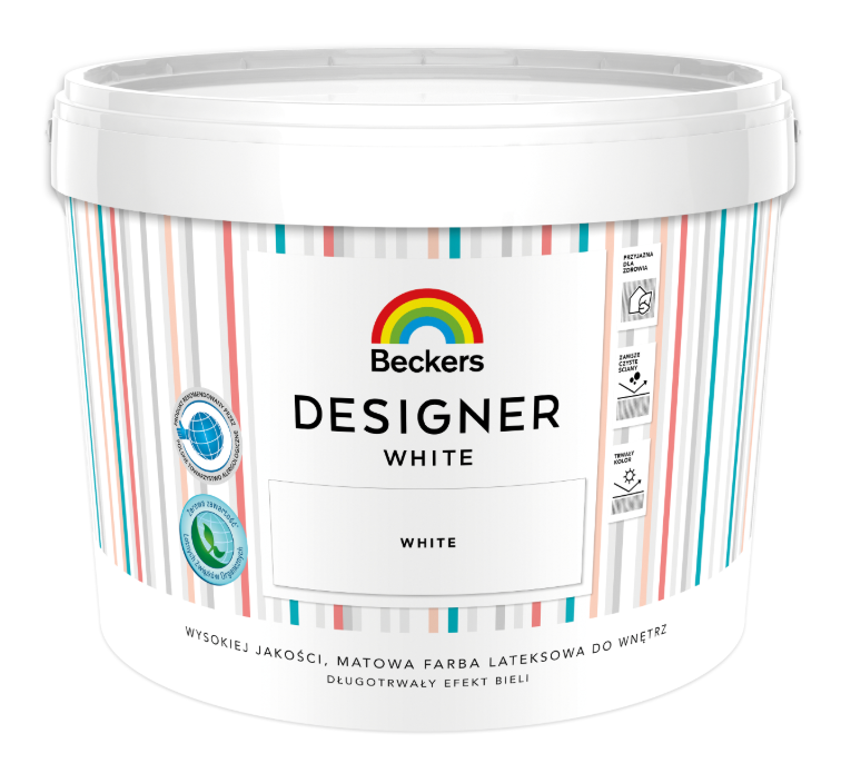 Beckers Designer White to wysokiej jakości, wodorozcieńczalna, biała farba lateksowa. Przeznaczona jest do malowania ścian i sufitów wewnątrz budynków. Pokryta nią powierzchnia zyskuje piękne, głęboko matowe wykończenie. Produkt jest bezpieczny dla alergików.