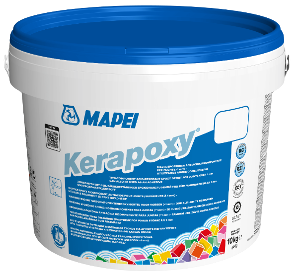 Fuga Kerapoxy firmy Mapei to zaprawa epoksydowa, dwuskładnikowa o właściwościach kwasoodpornych przeznaczona do fugowania spoin na okładzinach z płytek płytek ceramicznych, kamiennych, betonu i innych materiałów budowlanych. Może mieć zastosowanie jako klej.