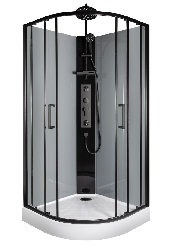 Kabina prysznicowa z hydromasażem Wega 90 w czarnym kolorze to nowoczesne i funkcjonalne rozwiązanie, które sprawdzi się zarówno w mniejszych, jak i większych łazienkach. Jej kompaktowe wymiary (90 × 90 × 215 cm) oraz półokrągły kształt pozwalają na łatwe dopasowanie do różnych przestrzeni. Kabina została wykonana z hartowanego szkła o grubości 4 mm, pokrytego powłoką ochronną Kerra Protect, która ogranicza osadzanie się kamienia i ułatwia utrzymanie czystości.