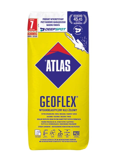 Klej żelowy wysokoelastyczny Atlas Geoflex 5 kg szary zawiera w swoim składzie żel krzemianowy, który zapewnia odpowiedni przepływ wody, wiążąc trwale klej z podłożem. Przeznaczony do szpachlowania i klejenia okładzin ceramicznych i kamiennych o różnym stopniu chłonności.
