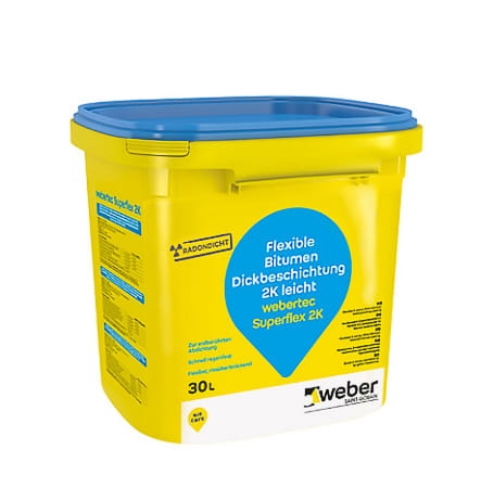 Weber.tec Superflex 2K to masa hydroizolacyjna, bitumiczna z wypełnieniem polistyrenowym, elastyczna, grubowarstwowa (odporna na wodę pod ciśnieniem). Nie zawiera rozpuszczalników organicznych (ekologiczna). Szybko wiąże, po krótkim czasie odporna na deszcz. Zastosowanie na zewnątrz budynków, na powierzchniach podziemnych, stykających się z gruntem. Pod jastrychami, na balkonach i tarasach i w pomieszczeniach nieprzeznaczonych na stały pobyt ludzi.