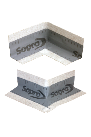 Narożnik uszczelniający wewnętrzny ( stosowany w narożach wewnętrznych pomieszczeń) firmy Sopro EDE 019, z fizelinową częścią montażową i środkową częścią izolacyjną. Gotowy element uformowany w kształcie narożnika, uzupełniający taśmę uszczelniającą Sopro DBF 638. Narożnik jest elastyczny i wodoodporny.