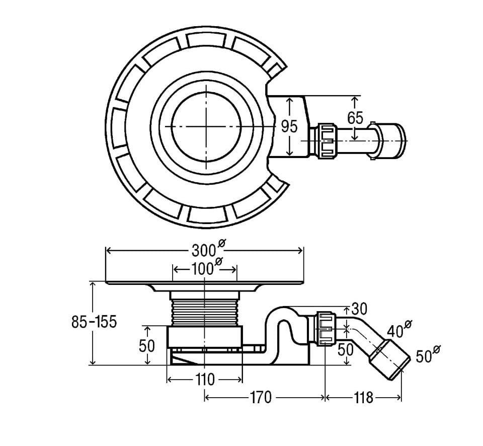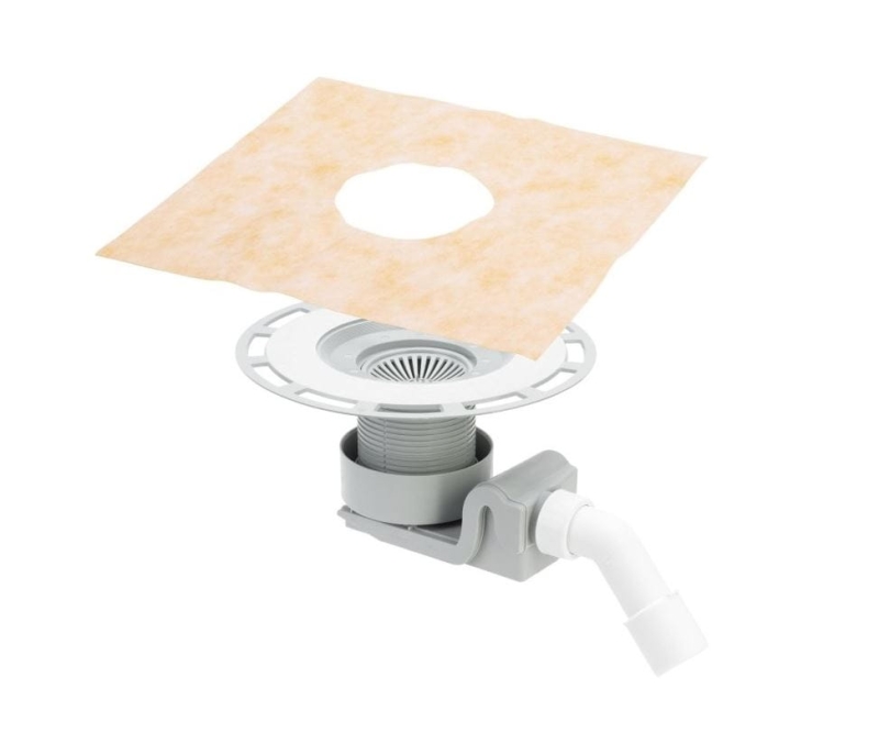 - W zestawie: element do wyrównania wysokości z tworzywa sztucznego, element ochronny, mata uszczelniająca Schlüter-KERDI, łuk odpływowy 45°
