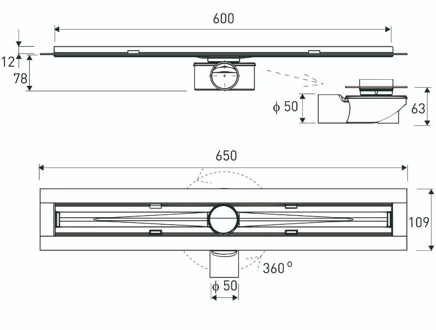 Obrotowy odpływ – szybki, obrotowy odpływ ze standardowym 50 mm odejściem do montażu w każdej poziomej pozycji w odróżnieniu od rynien ze stałym syfonem nieobrotowym.
