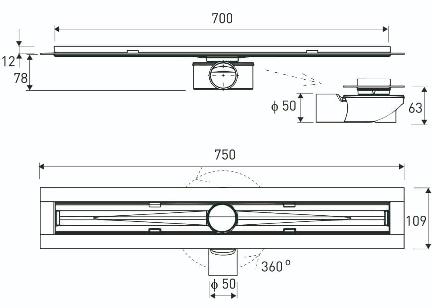 Obrotowy odpływ – szybki, obrotowy odpływ ze standardowym 50 mm odejściem do montażu w każdej poziomej pozycji w odróżnieniu od rynien ze stałym syfonem nieobrotowym.