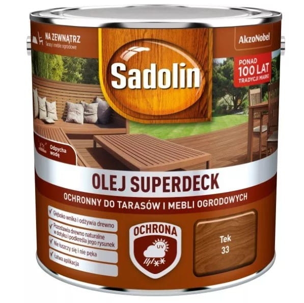 Olej do tarasów i mebli ogrodowych Sadolin Superdeck tek to nowoczesny olej przeznaczony do konserwacji tarasów drewnianych oraz mebli ogrodowych, a także innych powierzchni drewnianych na zewnątrz.