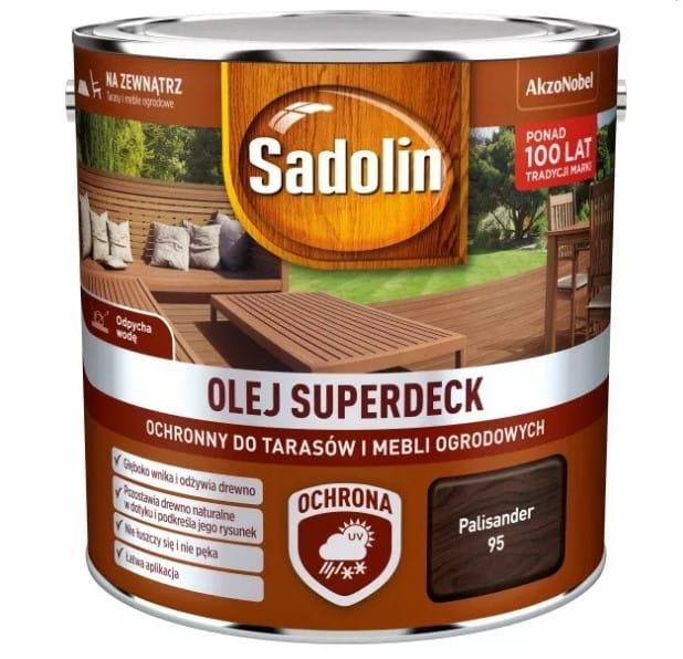 Sadolin Superdeck palisander 2,5 l to nowoczesny olej przeznaczony do konserwacji tarasów drewnianych oraz mebli ogrodowych, a także innych powierzchni drewnianych na zewnątrz.