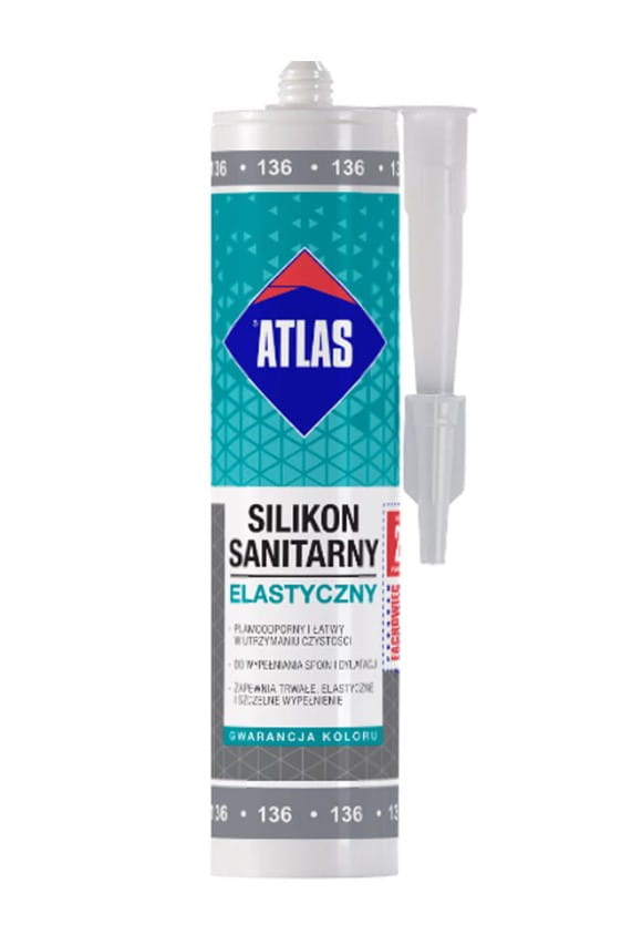 Silikon elastyczny sanitarny Atlas srebrny 280 ml 136 zalecany jest do uszczelniania krawędzi połączeń okładziny i elementów wyposażenia pomieszczenia – wokół kabin prysznicowych, brodzików, połączeń wokół mebli i armatury łazienkowej, umywalek, toalet, wanien, blatów kuchennych i wokół zlewozmywaków.