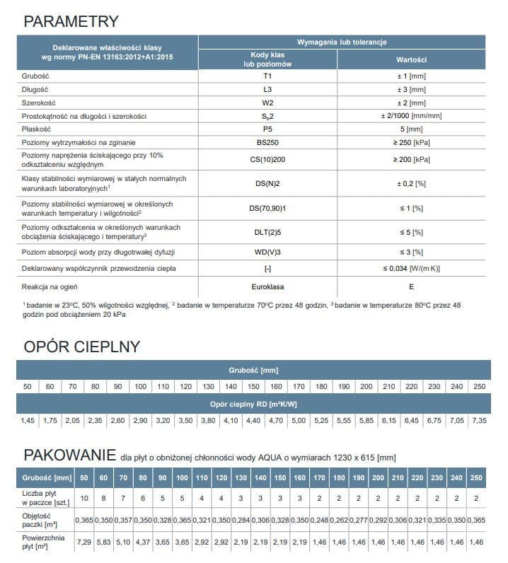 Płyty styropianowe AQUA EPS-P 200 produkowane są metodą spieniania i formowania wtryskowego polistyrenu wzbogaconego o środki obniżające chłonność wody. Płyty przeznaczone są do termoizolacji przegród budowlanych, w szczególności w miejscach zawilgoconych i narażonych na okresowe działanie wody. Produkt zgodny z normą zharmonizowaną EN 13163:2012+A1:2015.