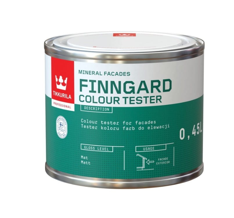 Wodorozcieńczalny, matowy, tester koloru farb elewacyjnych z rodziny Tikkurila Finngard. Po przeprowadzeniu testu powierzchnię należy pomalować farbą nawierzchniową