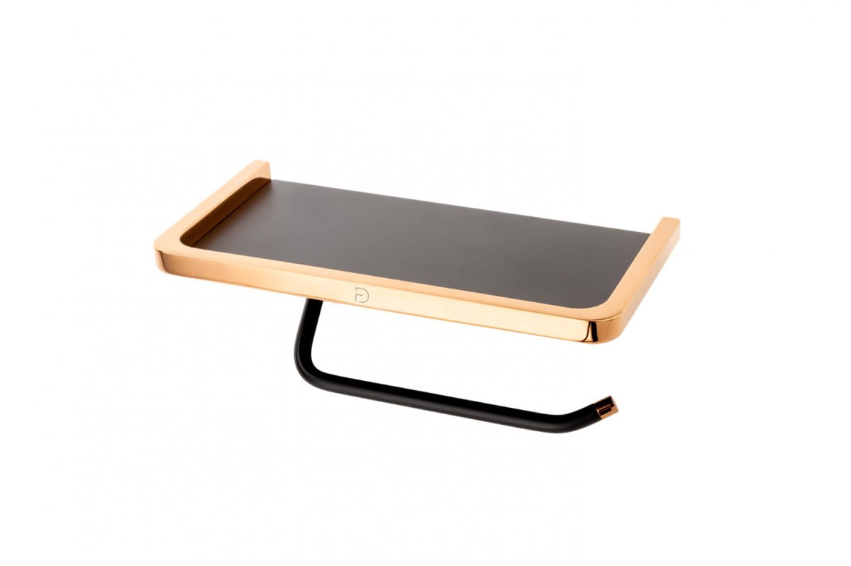 Fdesign Merida FD6-MRD10-25 to funkcjonalny wieszak na papier toaletowy, który został połączony z półką, na której możemy umieścić dodatkowe rolki papieru, kosmetyki lub inne łazienkowe drobiazgi. Fdesign Merida FD6-MRD10-25 przyciąga uwagę wysmakowanym designem, nieskazitelnie gładką powierzchnią, wspaniałymi formami oraz inspirującym zestawieniem barw. Delikatnie połyskujący kolor różowego złota w połączeniu z matową czernią zachwyci nas niezwykłą grą świateł.