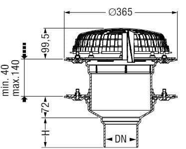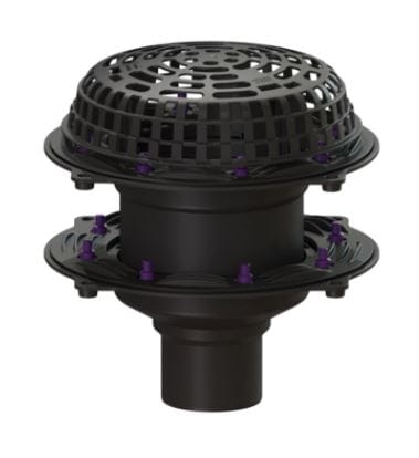 Wpust dachowy z podwójnym uszczelnieniem do zabudowy w betonie wodoszczelnym, z dociskowym kołnierzem uszczelniającym z tworzywa Ecoguss króciec odpływowy do przyłączenia rury PVC. Z pojedynczym uszczelnieniem z osłoną przed żwirem.