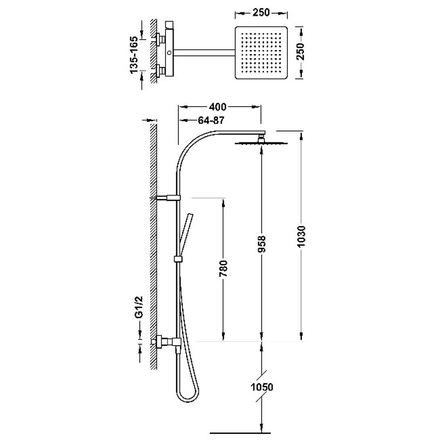 Deszczownica obrotowa ze stali nierdzewnej: 250x250 mm.· Obrotowy i przesuwny uchwyt do słuchawki prysznicowej.· Słuchawka prysznicowa z mosiądzu z systemem zapobiegającym osadzaniu się kamienia.· Satynowy wąż.